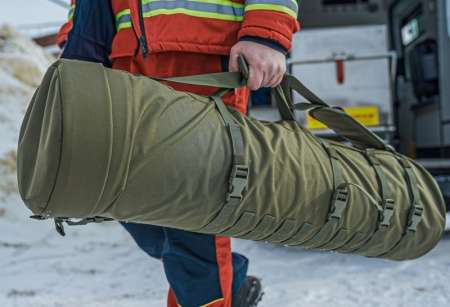 – Ремень, который накидывается на пояс или плечи человека, осуществляющего эвакуацию, позволяет уменьшить нагрузку при перемещении раненного и освободить руки для переноски другого оборудования.