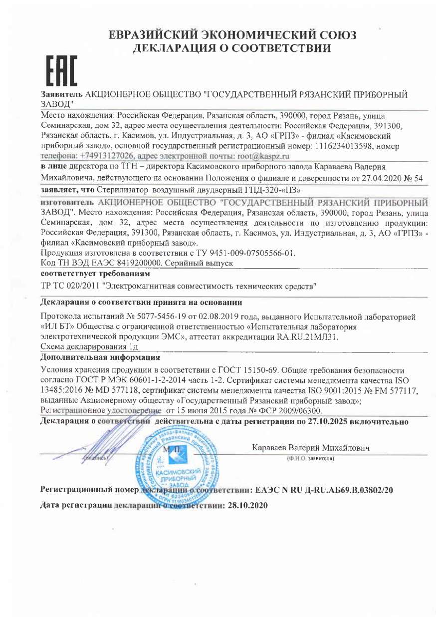 Воздушный стерилизатор ГПД-320 ПЗ очень вместителен. Его внутренний объем составляет 320 литров. Система эффективного принудительного охлаждения позволяет быстрей получить готовый к работе инструмент. Предназначен для стерилизации сухим горячим воздухом изделий, изготовленных из термостойких материалов (металлов, стекла, резин на основе силиконового каучука) – хирургических, стоматологических и других инструментов, термостойких шприцев (с отметкой 200°С) и игл к ним, стеклянной посуды и других изделий медицинского назначения. Стерилизатор используется для дезинфекции и сушки медицинских изделий.