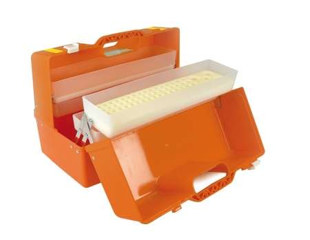 Описание: Укладка медицинская представляет собой пластиковый саквояж из высокопрочного холодо- и теплостойкого пластика. Чемодан скорой помощи оранжевого цвета, имеет удобные, вандалопрочные ручку и замки, исключающие его открытие при транспортировке. Дно укладки скорой помощи прочное, износостойкое. Верхняя часть футляра выполнена в виде створок, открывающихся в стороны, в створках установлены лотки с ложементом для ампул и флаконов антисептиков. Створки крепятся к дну надёжными петлями со стальным стержнем внутри. При открытии медицинского ящика обеспечена постоянная вертикальная ориентация лотков и удобный доступ к содержимому лотков и дна футляра. Открытая медицинская укладка, по существу, является комфортным, рабочим местом. Ложемент обеспечивает полный набор мест для ампул, ампулы ориентированы вертикально, не «звенят» и не бьются. На верхней поверхности медицинской укладки имеется бирочное окошко для обозначения номера бригады или названия набора. Незаменима для муниципальных линейных бригад СМП с большой интенсивностью вызовов.