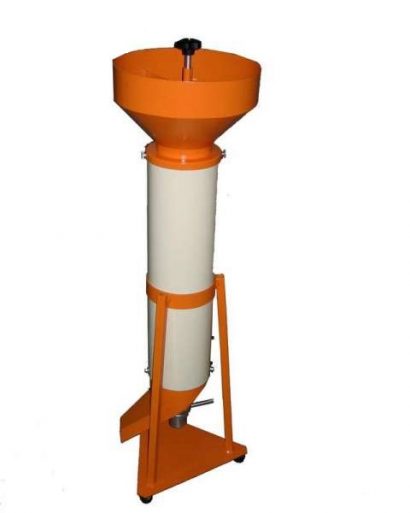 Универсальный делитель зерна УДЗ-1М используется при отборе навески требуемой массы из исходной пробы зерновых, масленичных, бобовых культур объемом до 8 литров методом равенства площадей в пропускном сечении прибора по проходу и сходу анализируемого продукта. Есть возможность выделить навеску 10г, что очень важно при работе с рапсом и другими мелкосеменными культурами. Прибор применяется в лабораториях зерноприёмных предприятий, научно-исследовательских организациях и др. Может быть использован для гранулированных или других легкосыпучих продуктов в других отраслях промышленности. Описание работы: Перед загрузкой зерна в бункер убедиться, что клапан закрыт и находится в нижнем положении. Емкость для приемки выделяемой навески следует установить под центральное отверстие коллектора , емкость для приёма остального зерна – под боковое отверстие коллектора. В зависимости от требуемой массы навески установить риску лимба коллектора на предполагаемом делении шкалы. Ориентировочные положения отметки для выделяемых навесок приведены в таблице:
